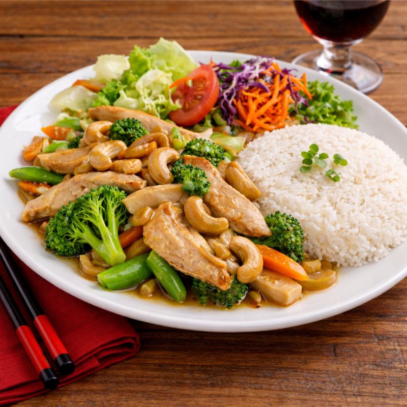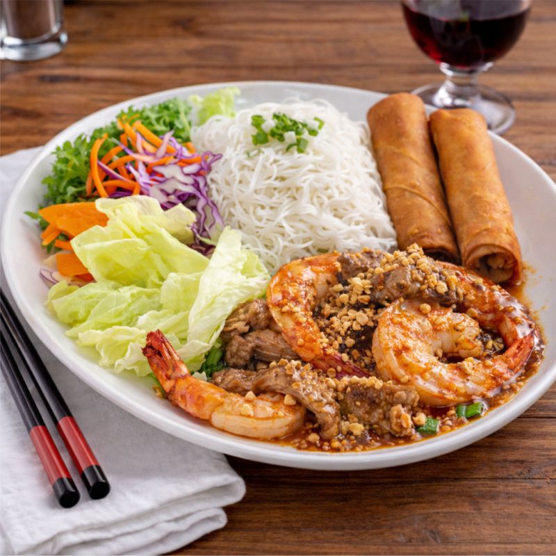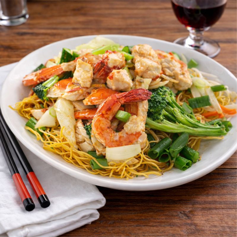 Chow-Mein de Canton Sauté de poulet de grain, crevettes et goberge, variété de légumes, douce sauce asiatique sur un nid de nouilles croustillantes Chicken, shrimp and pollock sautéed with mixed vegetables in a delicate Asian sauce over crispy noodles À LA CARTE 24,95 TABLE D’HÔTE 38,95