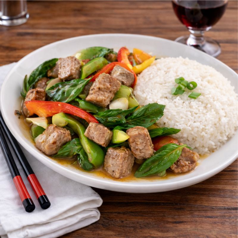 Sauté de filet mignon au basilic Cubes de filet mignon AAA sautés avec poivrons, oignons, ananas, feuilles de basilic, gousses de poivre et sauce asiatique Cubed AAA filet mignon sautéed with peppers, onions, pineapple, fresh basil and garlic pepper in an Asian sauce À LA CARTE 28,95 TABLE D’HÔTE 45,95