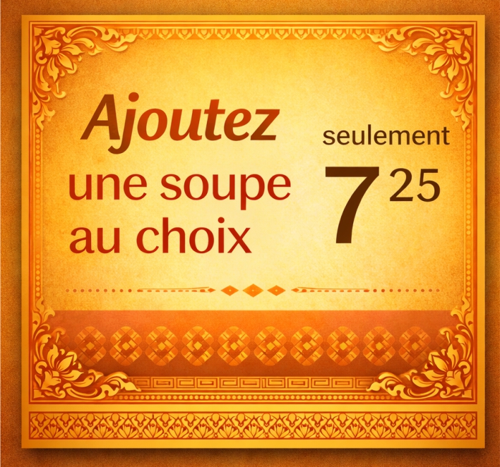 * Ces plats contiennent des ingrédients à base d’arachides, d’huile, de poisson fermenté, etc. En cas d’allergie, veuillez en informer le personnel. Les plats ne sont pas conçus pour des personnes allergiques.