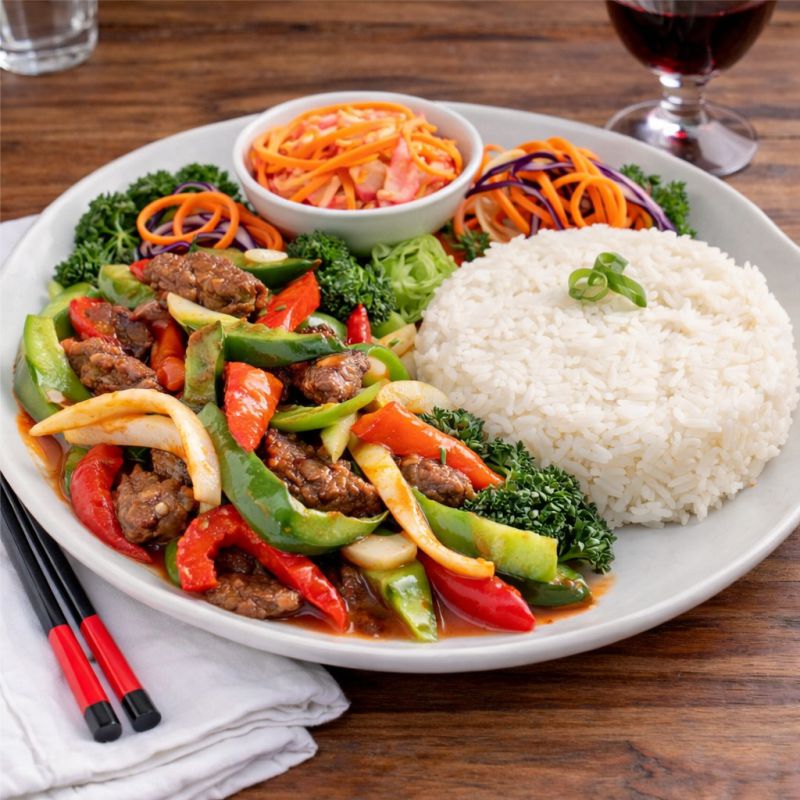 D) Aux légumes 🧂 Boeuf sauté, variété de légumes, douce sauce asiatique, poivre moulu Sautéed beef and vegetables with a sweet asian sauce topped with ground pepper