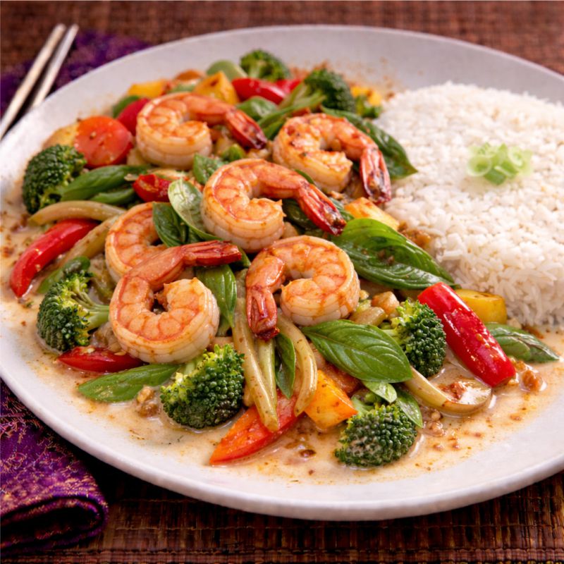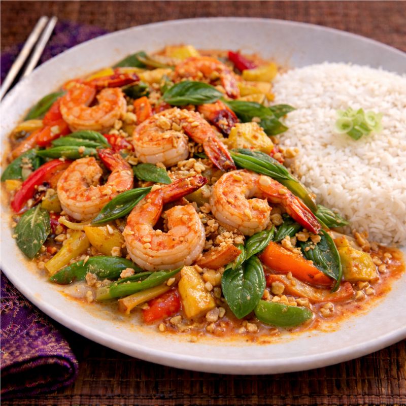 Crevettes sautées, poivrons verts et rouges, ananas, feuilles de basilic, sauce thaïlandaise pimentée Sautéed shrimp, green peppers, pineapple and fresh basil leaves with a thai chilli sauce