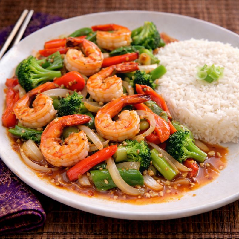 Malacca Crevettes sautées, poivrons verts et rouges, oignons, sauce asiatique parfumée Sautéed shrimp, green and red peppers, onion with an asian style sauce