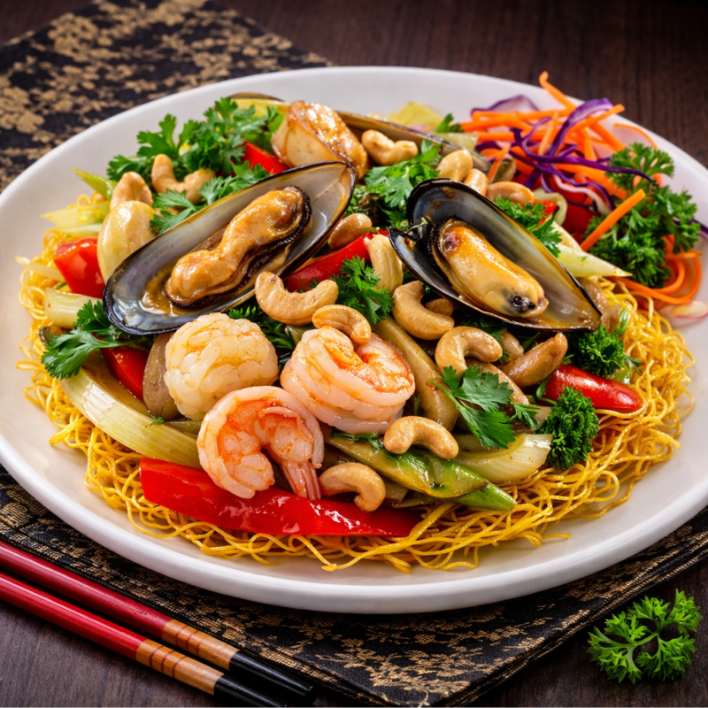 Sauté de crevettes, pétoncles et moules, noix d’acajou, variété de légumes, douce sauce asiatique et poivre moulu, servi sur nid de nouilles croustillantes