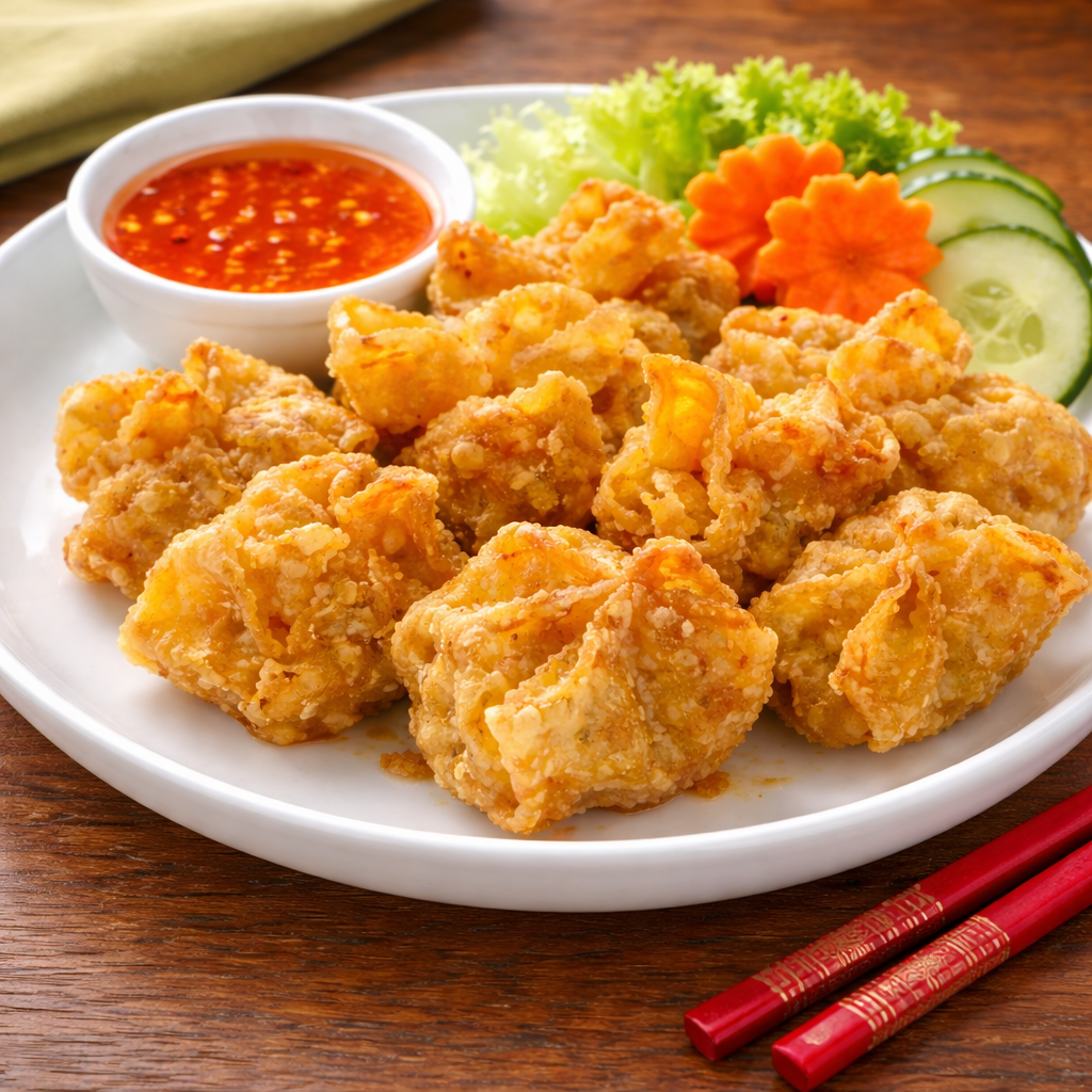 Papillotes de porc et crevettes, sauce impériale Crispy pork and shrimp papillotes accompanied by a side of imperial sauce