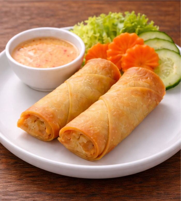Rouleaux de viande croustillants, oignons, sauce impériale Crispy pork imperial rolls embedded with onion and accompanied by a side of imperial sauce