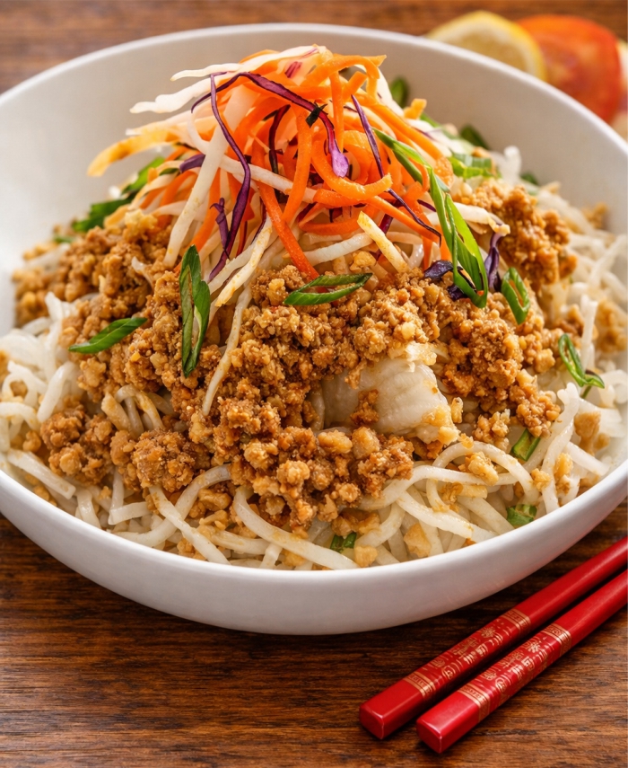 Laitue, tomates, porc maigre haché, sauce épicée, cari rouge sur vermicelles de riz croustillants Fresh lettuce and tomato based Thai salad topped with lean pork, spicy red curry sauce on crispy rice noodles